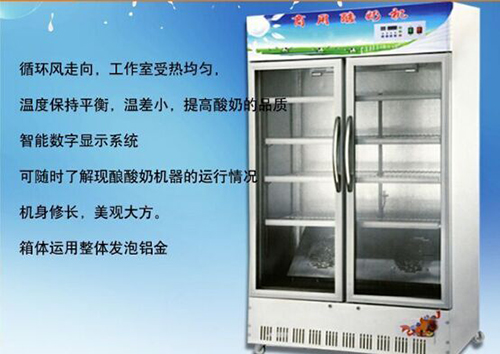 商用酸奶机,是一种商用制造酸奶的机器。给牛奶发酵提供一个恒定温度的装置,温度35-45度之间,在这个环境下,益生菌大量繁殖,牛奶中乳糖转化成乳酸,牛奶发酵成酸奶。